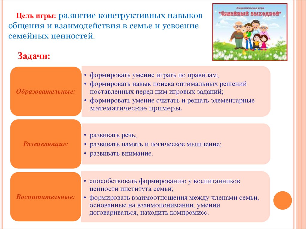 Цель игры: развитие конструктивных навыковобщения и взаимодействия в семье и усвоение