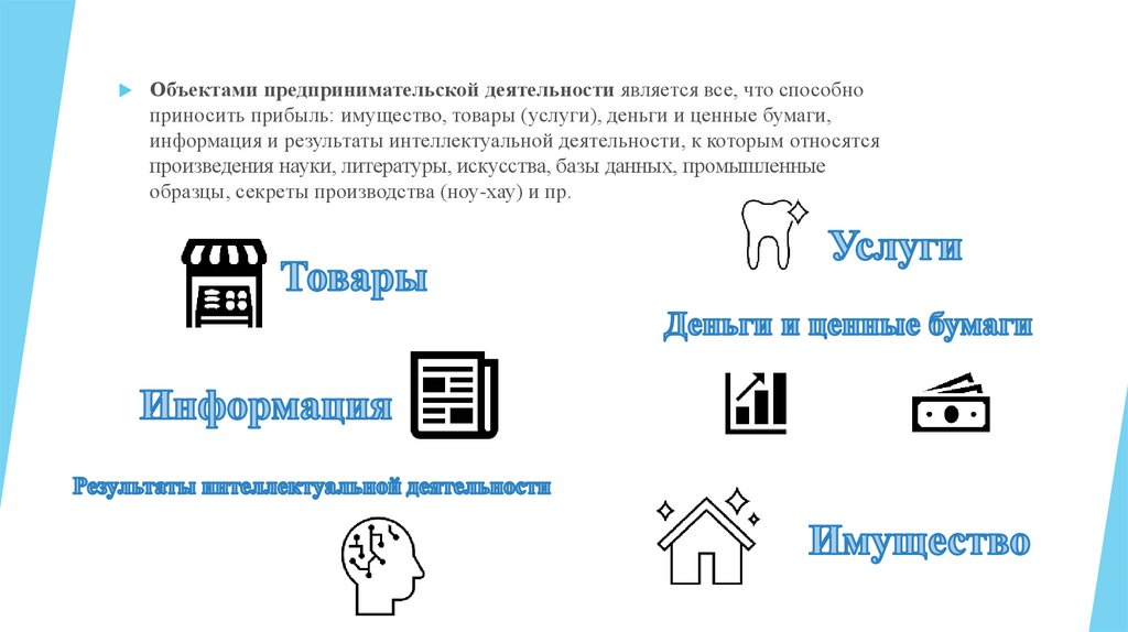 Объектами предпринимательской деятельности является все, что способноприносить прибыль: имущество, товары (услуги), деньги и ценные бумаги,