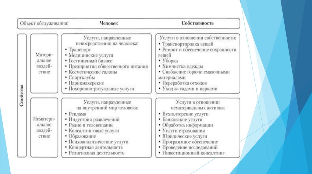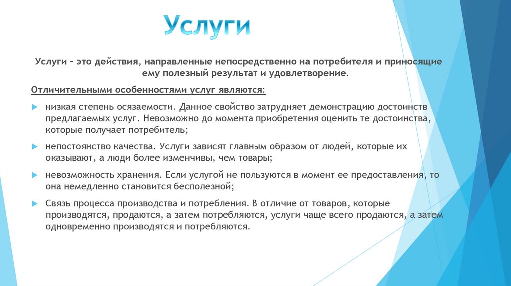 Услуги – это действия, направленные непосредственно на потребителя и приносящиеему полезный результат и удовлетворение.