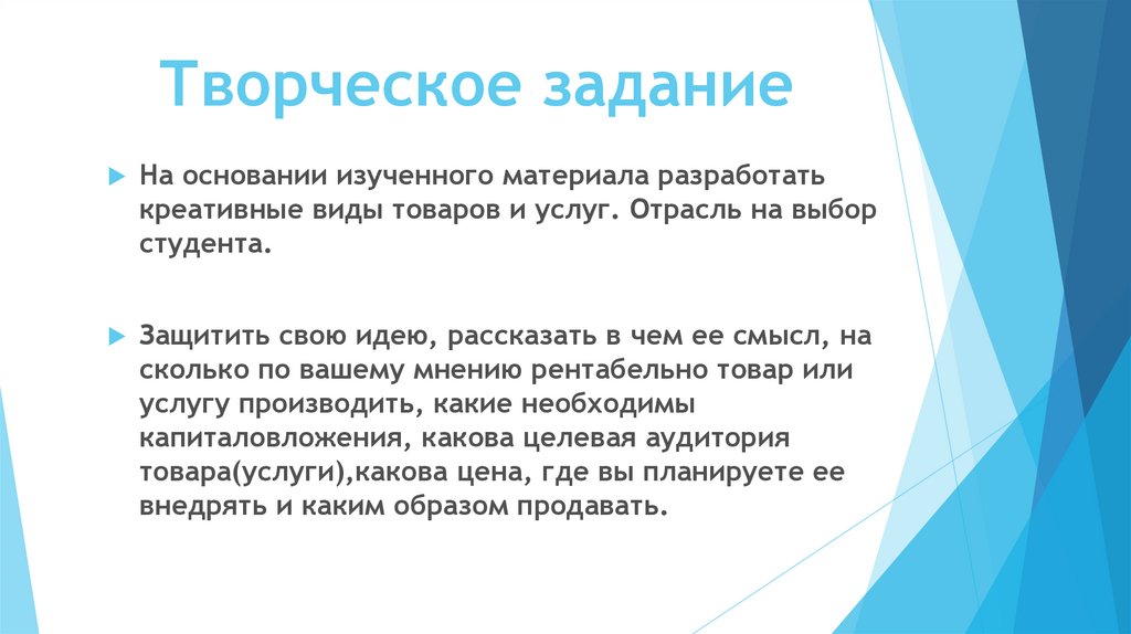 креативные виды товаров и услуг. Отрасль на выбор