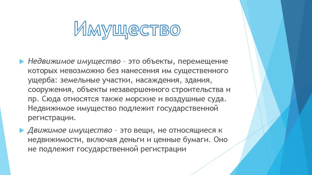 Недвижимое имущество – это объекты, перемещениекоторых невозможно без нанесения им существенного