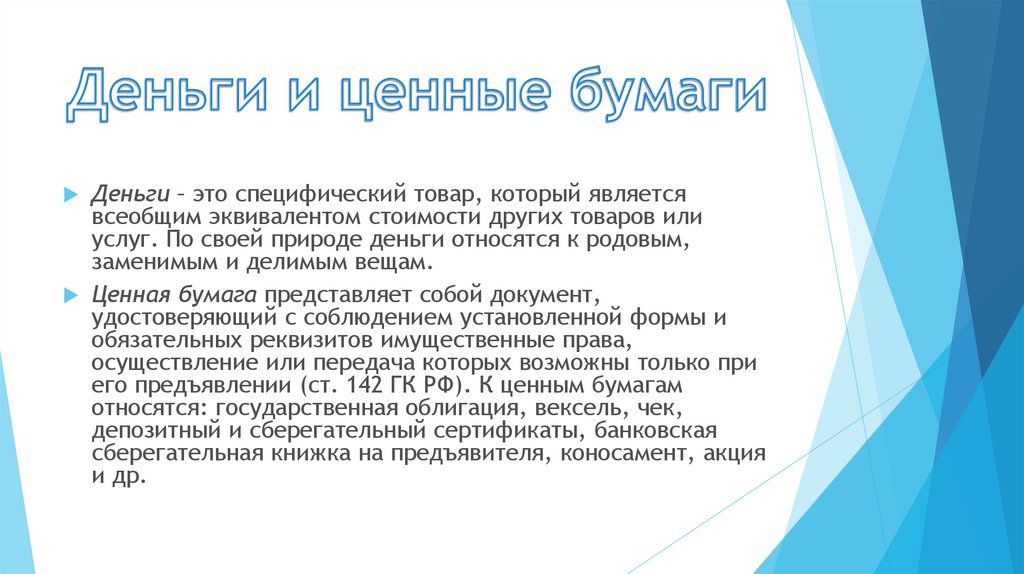 его предъявлении (ст. 142 ГК РФ). К ценным бумагам