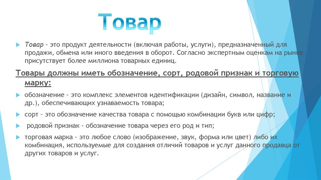 Товар – это продукт деятельности (включая работы, услуги), предназначенный дляпродажи, обмена или иного введения в оборот. Согласно экспертным оценкам на рынке