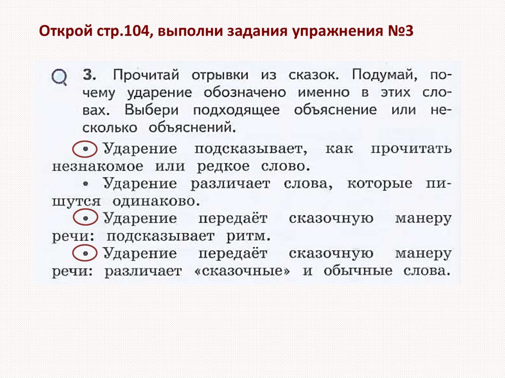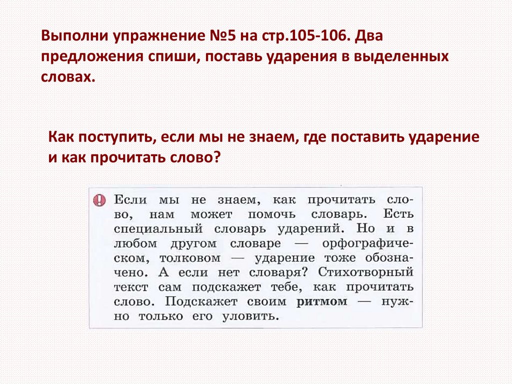 Выполни упражнение №5 на стр.105-106. Двапредложения спиши, поставь ударения в выделенных