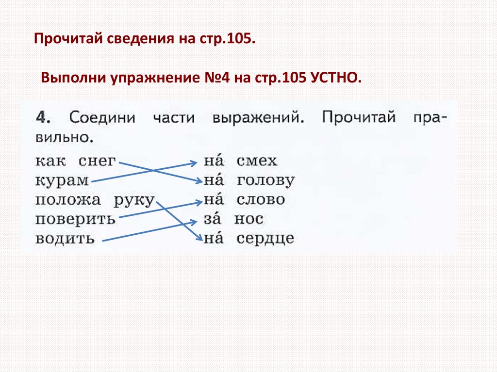 Прочитай сведения на стр.105.Выполни упражнение №4 на стр.105 УСТНО.