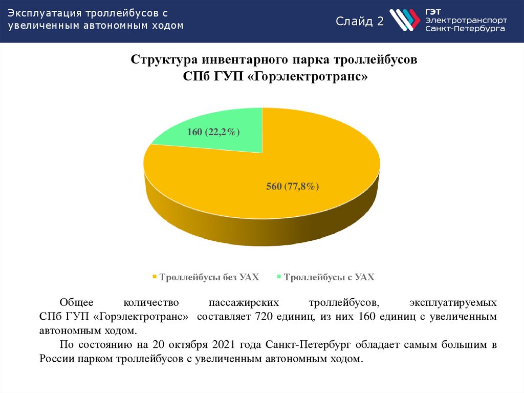СПб ГУП «Горэлектротранс» составляет 720 единиц, из них 160 единиц с увеличенным