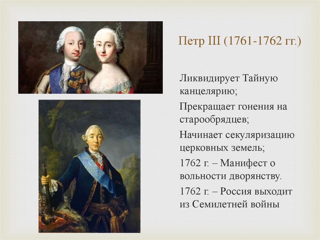 Петр III (1761-1762 гг.)Ликвидирует Тайную