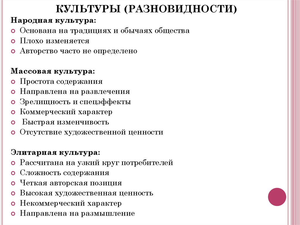 КУЛЬТУРЫ (РАЗНОВИДНОСТИ)Народная культура: