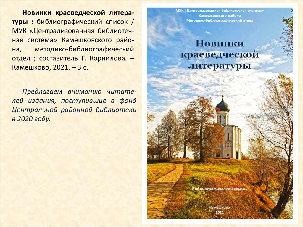 Новинки краеведческой литературы : библиографический список /МУК «Централизованная библиотечная система» Камешковского района,