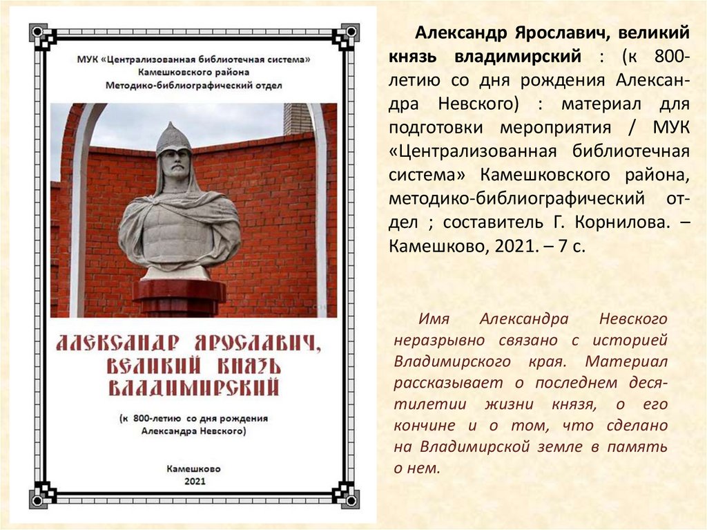 Александр Ярославич, великийкнязь владимирский : (к 800летию со дня рождения Александра Невского) : материал для
