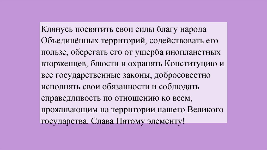 Клянусь посвятить свои силы благу народаОбъединённых территорий, содействовать его