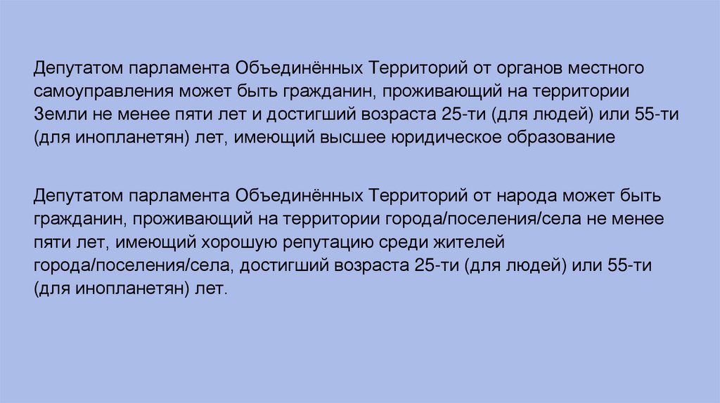 Депутатом парламента Объединённых Территорий от органов местногосамоуправления может быть гражданин, проживающий на территории
