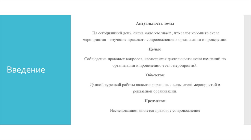 Актуальность темыНа сегодняшний день, очень мало кто знает , что залог хорошего event