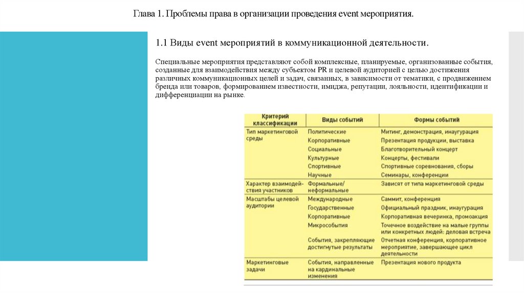 Глава 1. Проблемы права в организации проведения event мероприятия.1.1 Виды event мероприятий в коммуникационной деятельности.