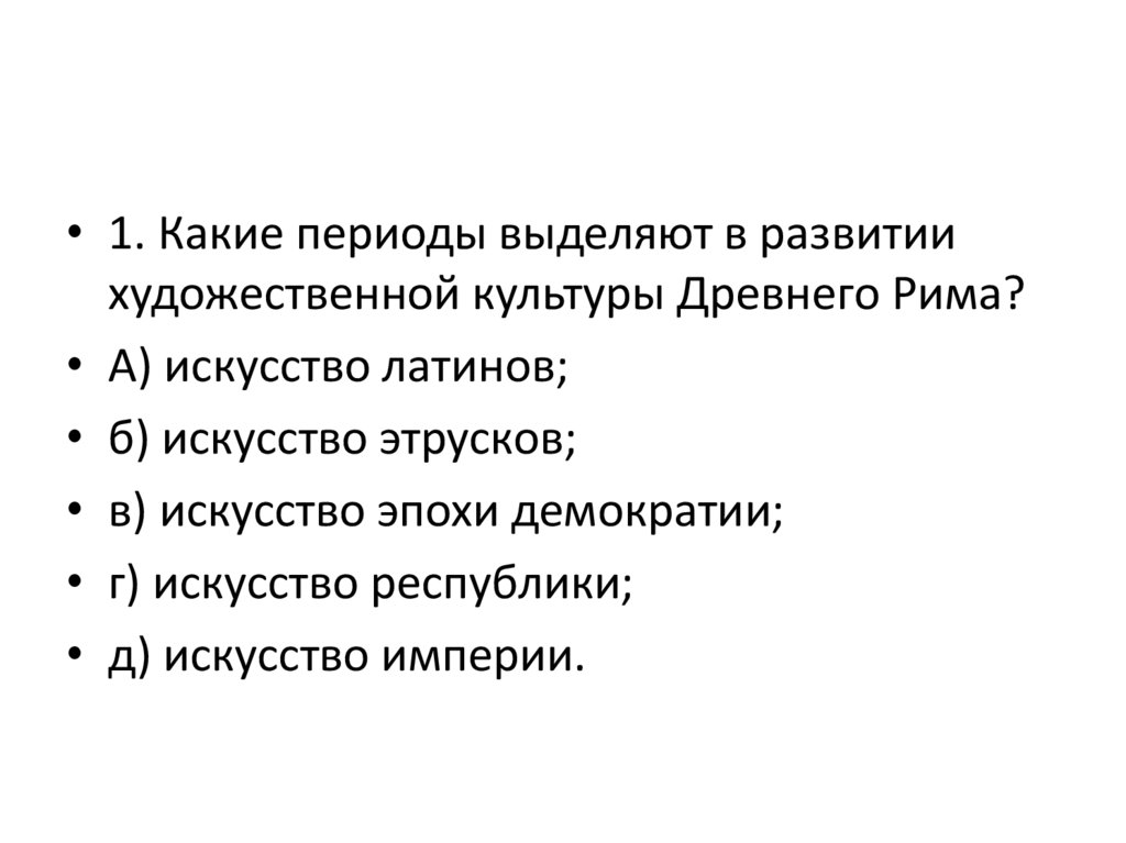 • 1. Какие периоды выделяют в развитиихудожественной культуры Древнего Рима?