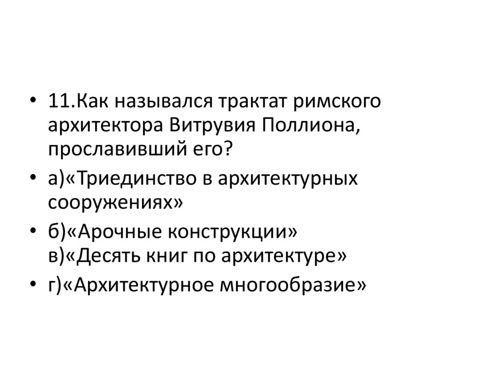 • 11.Как назывался трактат римскогоархитектора Витрувия Поллиона,