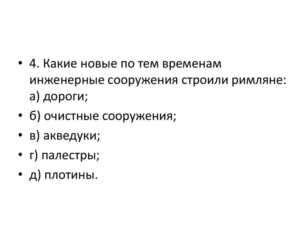 • 4. Какие новые по тем временаминженерные сооружения строили римляне: