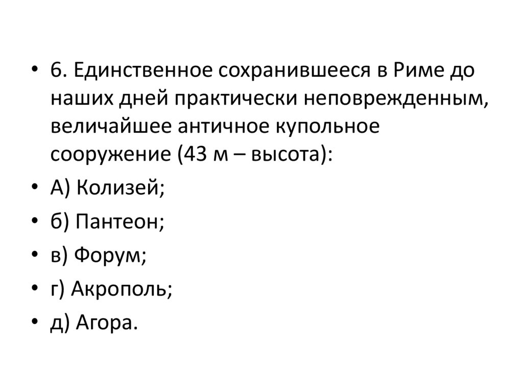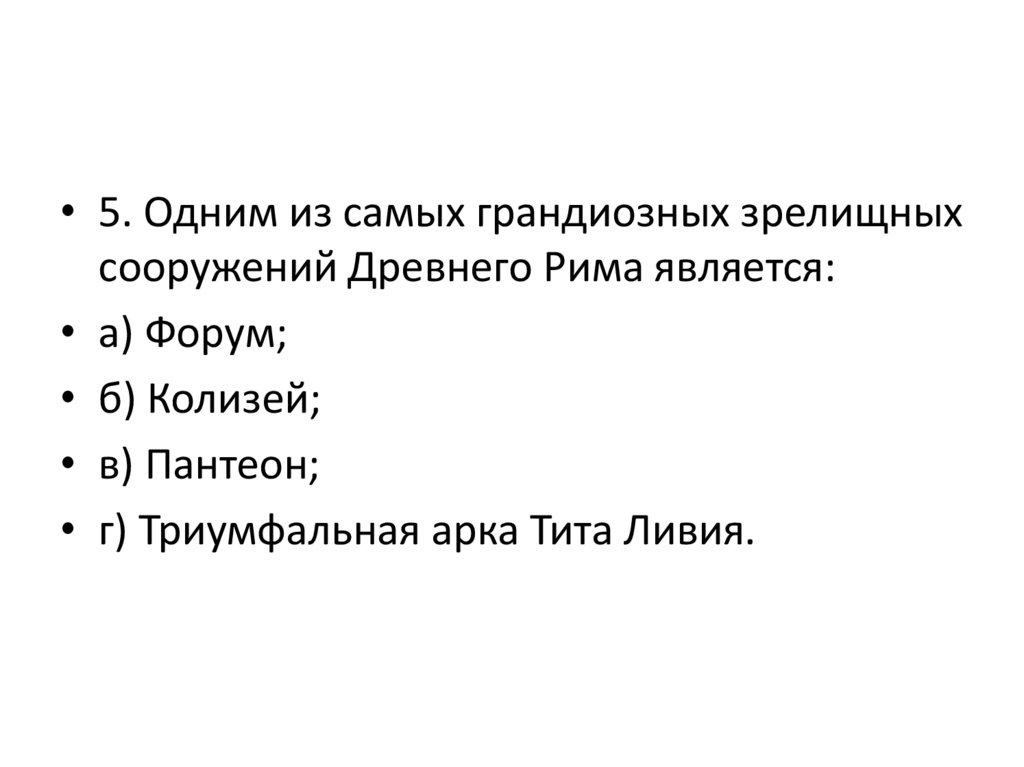 • 5. Одним из самых грандиозных зрелищныхсооружений Древнего Рима является: