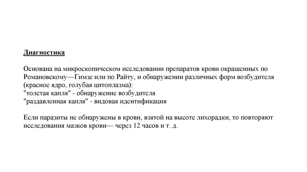 ДиагностикаОснована на микроскопическом исследовании препаратов крови окрашенных по