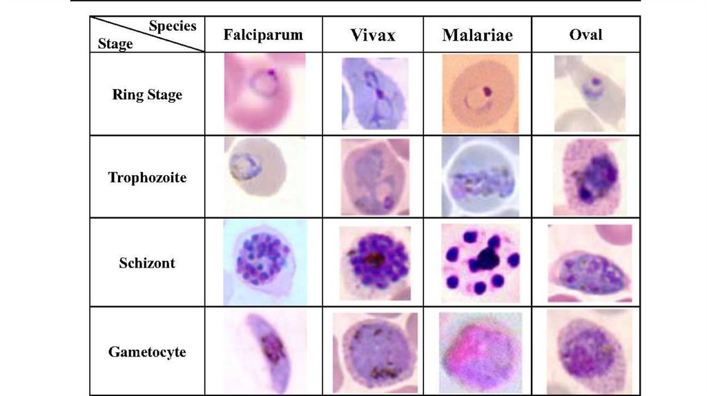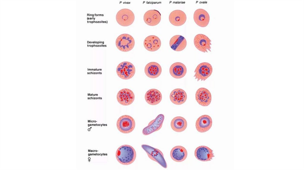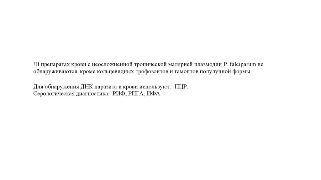 !В препаратах крови с неосложненной тропической малярией плазмодии Р. falciparum необнаруживаются, кроме кольцевидных трофозоитов и гамонтов полулунной формы.