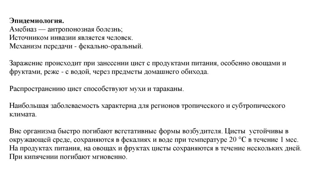 Эпидемиология.Амебиаз — антропонозная болезнь;