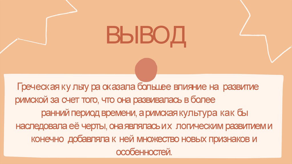 ВЫВОДГреческая ку льту ра оказала большее влияние на развитие