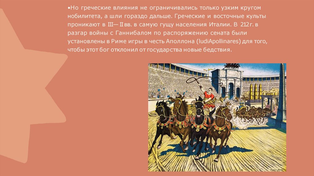 •Но греческие влияния не ограничивались только узким кругомнобилитета, а шли гораздо дальше. Греческие и восточные культы