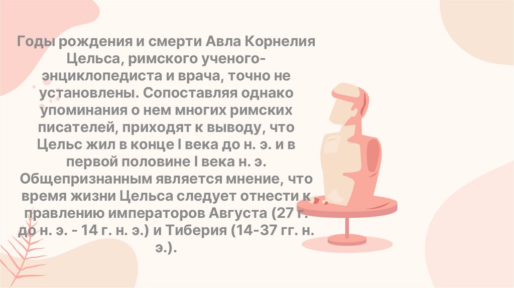 Годы рождения и смерти Авла КорнелияЦельса, римского ученогоэнциклопедиста и врача, точно не