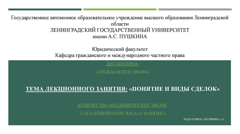 ТЕМА ЛЕКЦИОННОГО ЗАНЯТИЯ: «ПОНЯТИЕ И ВИДЫ СДЕЛОК»
