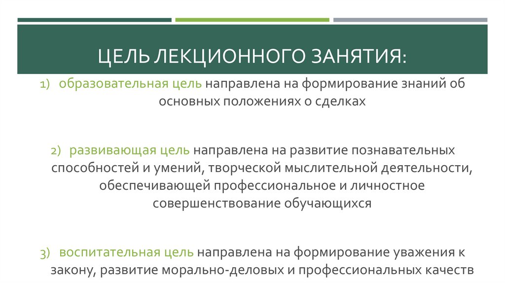 ЦЕЛЬ ЛЕКЦИОННОГО ЗАНЯТИЯ:1) образовательная цель направлена на формирование знаний об