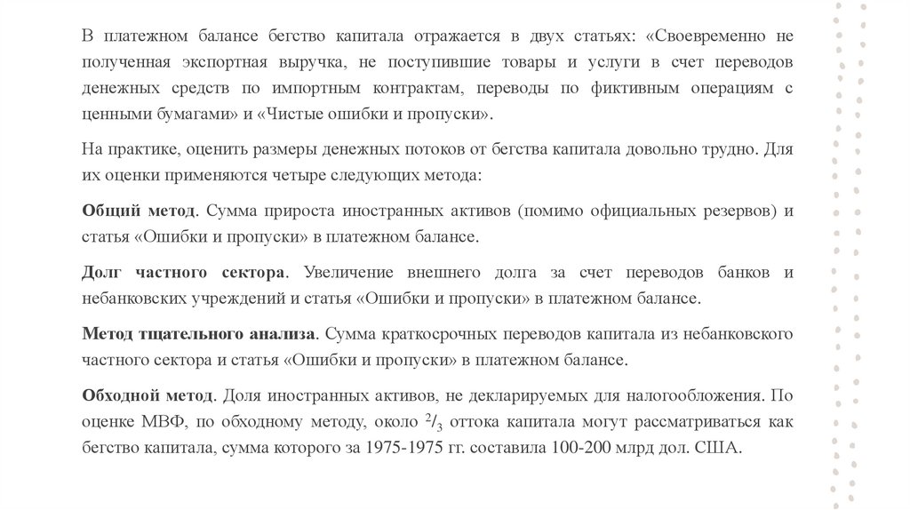 оценке МВФ, по обходному методу, около 2/3 оттока капитала могут рассматриваться как