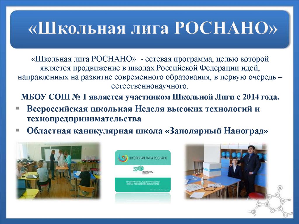 «Школьная лига РОСНАНО» - сетевая программа, целью которойявляется продвижение в школах Российской Федерации идей,