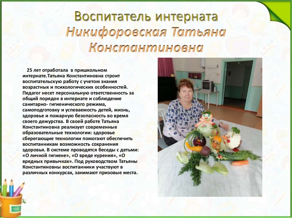 25 лет отработала в пришкольноминтернате.Татьяна Константиновна строит