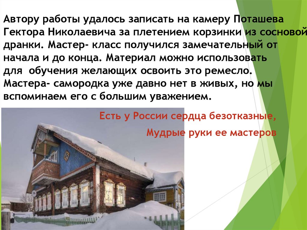 Автору работы удалось записать на камеру ПоташеваГектора Николаевича за плетением корзинки из сосновой