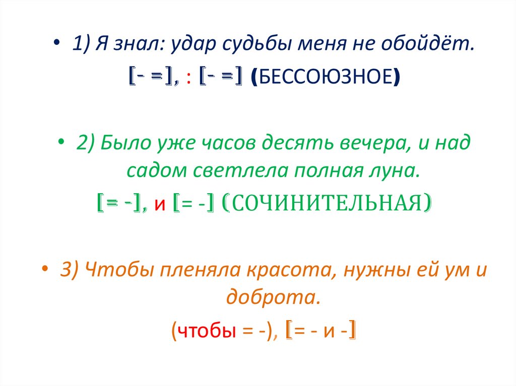 • 1) Я знал: удар судьбы меня не обойдёт.[- =], : [- =] (БЕССОЮЗНОЕ)