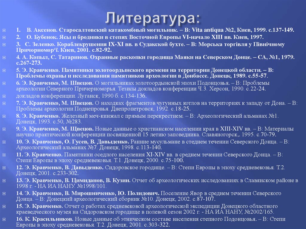 1. В. Аксенов. Старосалтовский катакомбный могильник. – В: Vita antiqua №2, Киев, 1999. с.137-149.2. О. Бубенок. Ясы и бродники в степях Восточной Европы VI-начало XIII вв. Киев, 1997.