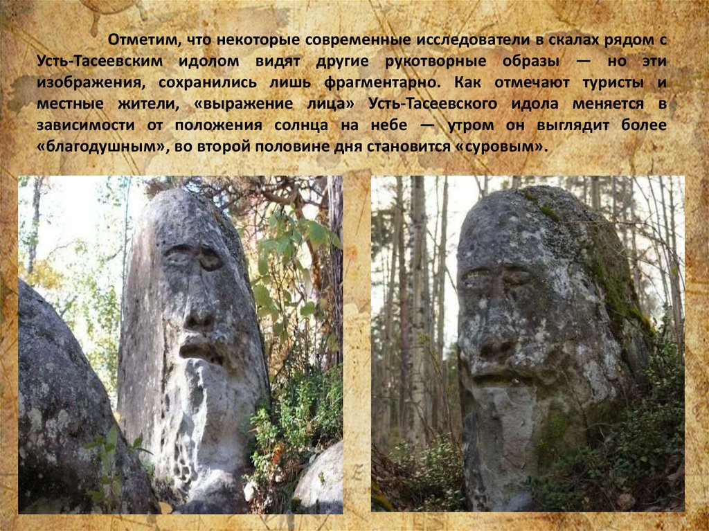 Отметим, что некоторые современные исследователи в скалах рядом сУсть-Тасеевским идолом видят другие рукотворные образы — но эти