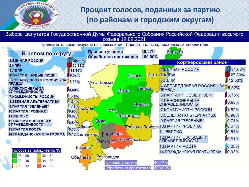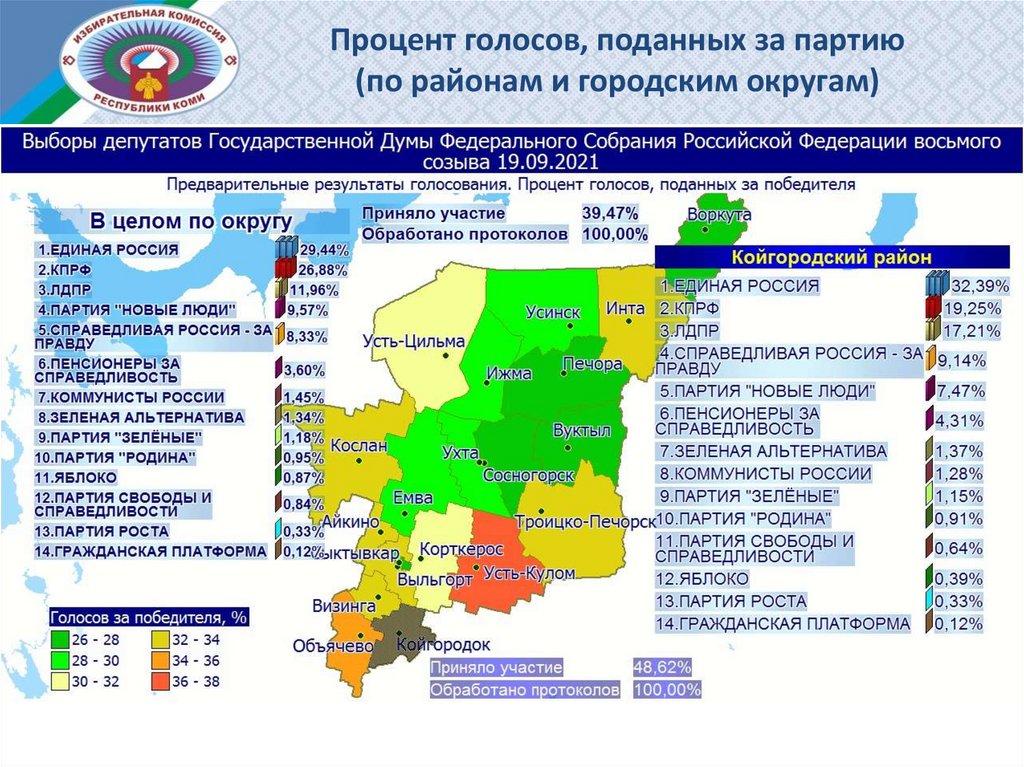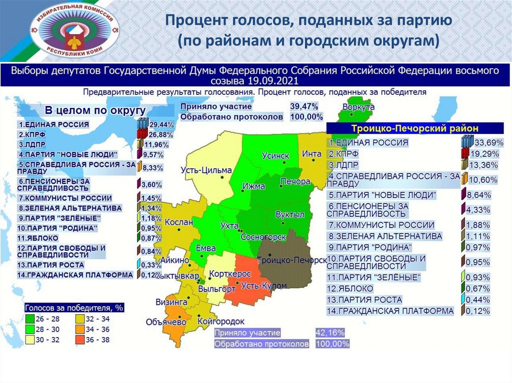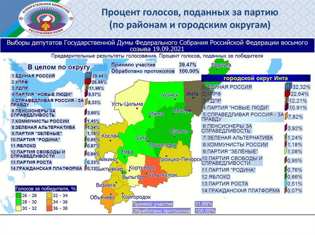 Процент голосов, поданных за партию (по районам и городским округам)