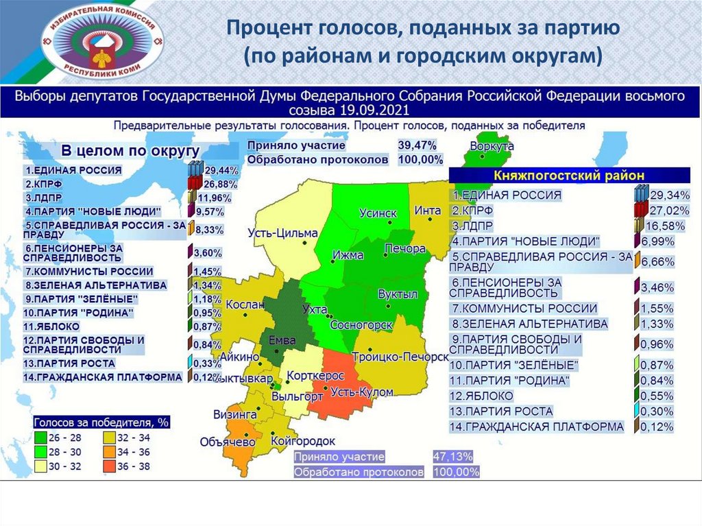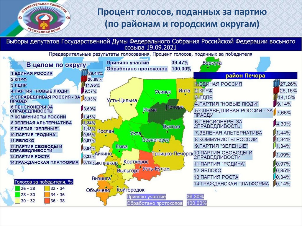 Процент голосов, поданных за партию(по районам и городским округам)
