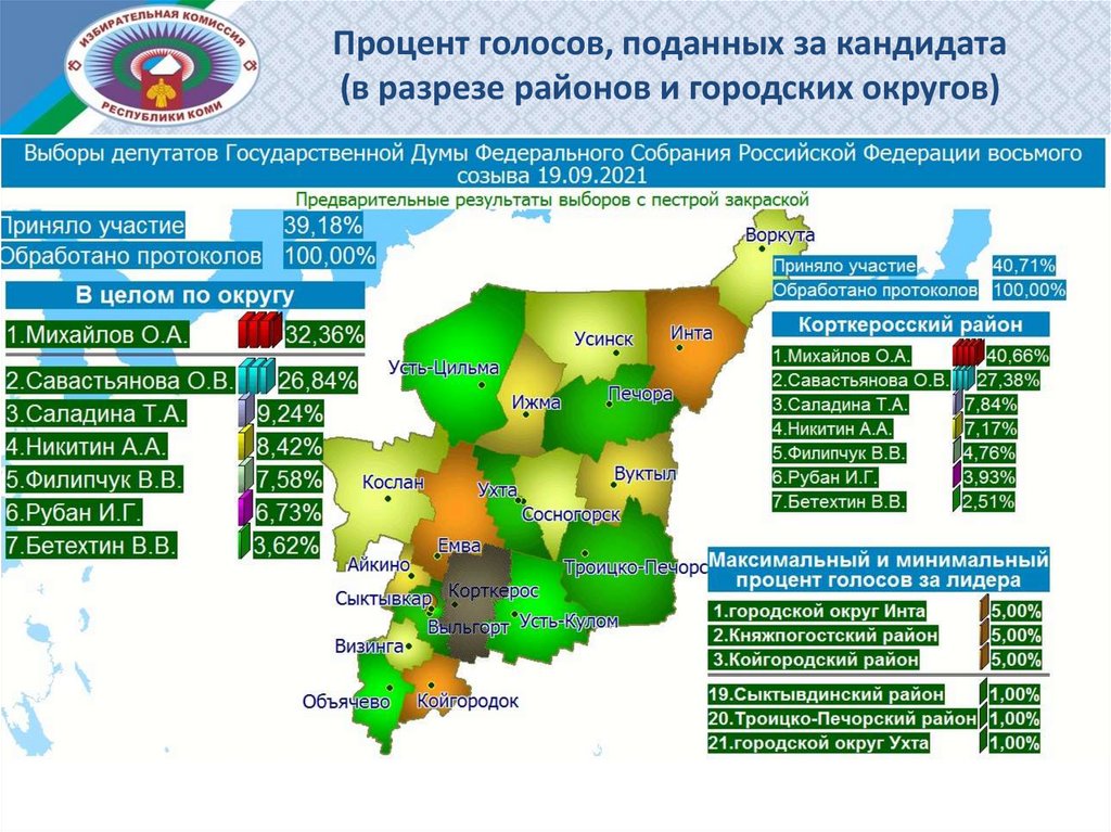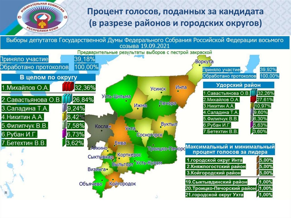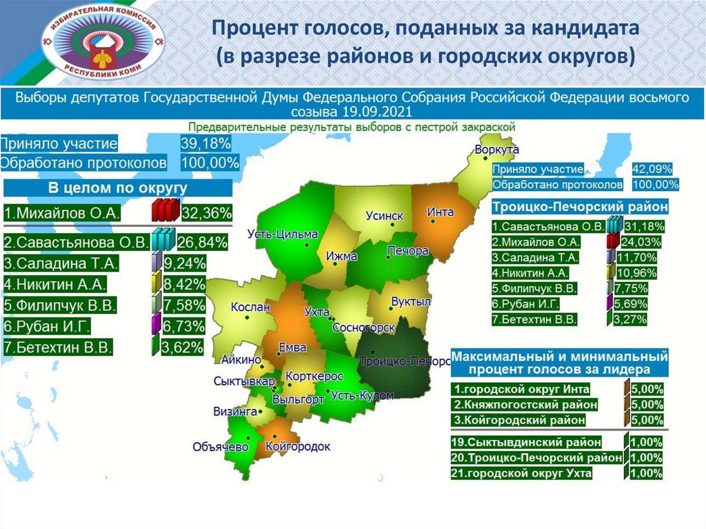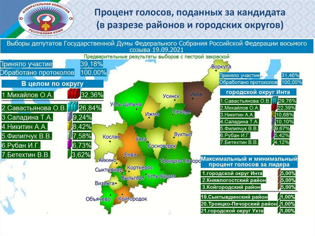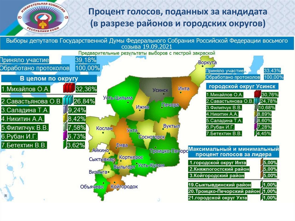 Процент голосов, поданных за кандидата (в разрезе районов и городских округов)