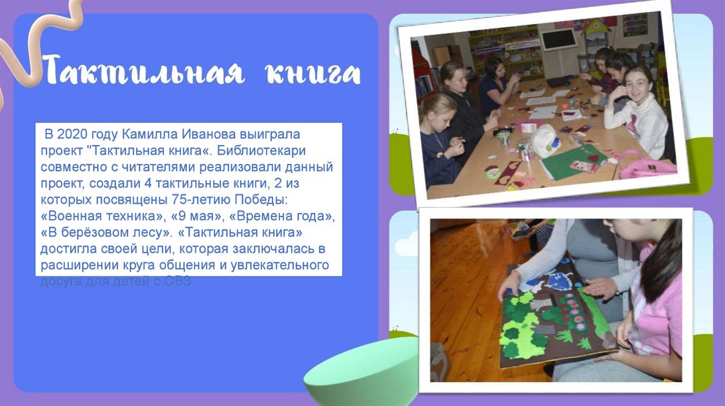 В 2020 году Камилла Иванова выигралапроект "Тактильная книга«. Библиотекари