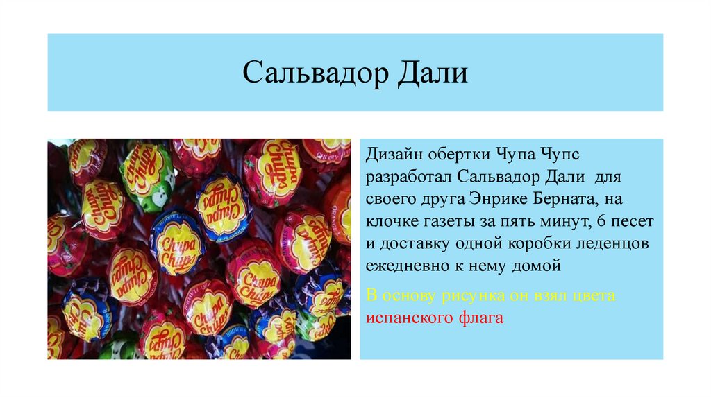 Кто разработал дизайн бренда Чупа Чупс?7.