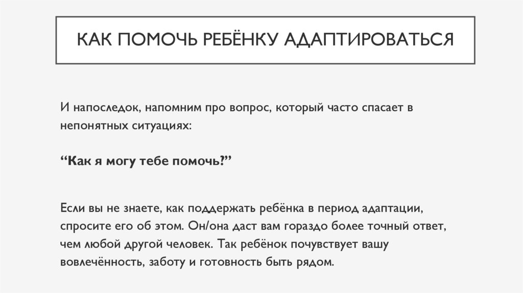 КАК ПОМОЧЬ РЕБЁНКУ АДАПТИРОВАТЬСЯИ напоследок, напомним про вопрос, который часто спасает в