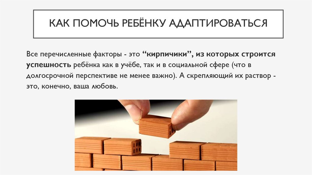 КАК ПОМОЧЬ РЕБЁНКУ АДАПТИРОВАТЬСЯВсе перечисленные факторы - это “кирпичики”, из которых строится