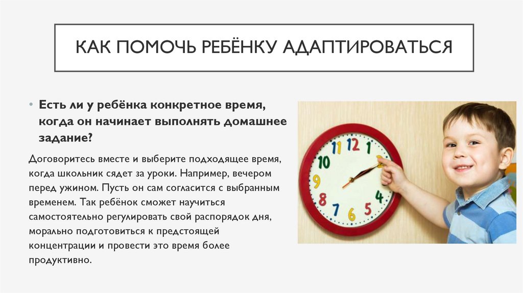 КАК ПОМОЧЬ РЕБЁНКУ АДАПТИРОВАТЬСЯ• Есть ли у ребёнка конкретное время,