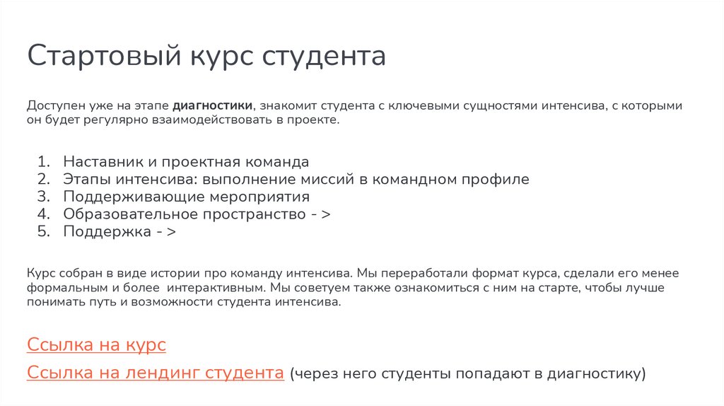 Стартовый курс студентаДоступен уже на этапе диагностики, знакомит студента с ключевыми сущностями интенсива, с которыми