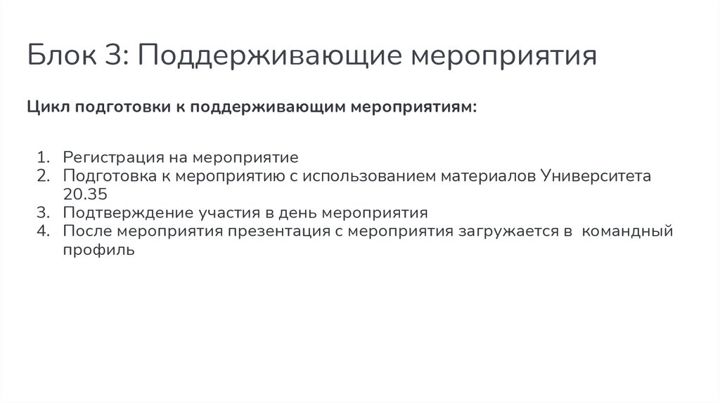 Блок 3: Поддерживающие мероприятияЦикл подготовки к поддерживающим мероприятиям: