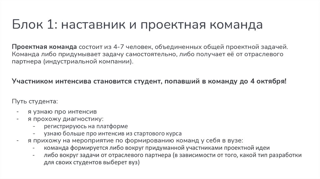 Блок 1: наставник и проектная командаПроектная команда состоит из 4-7 человек, объединенных общей проектной задачей.
