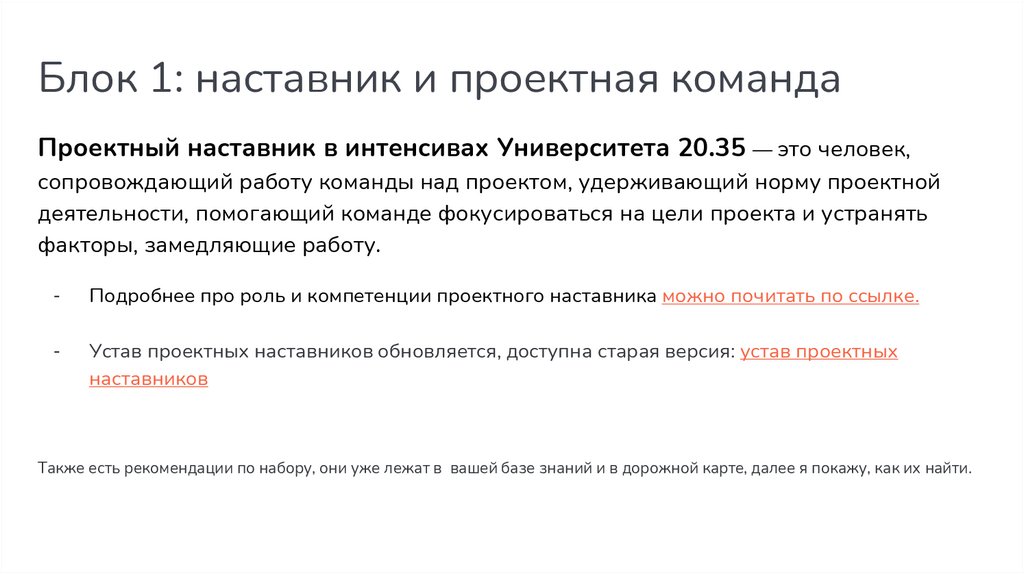 Блок 1: наставник и проектная командаПроектный наставник в интенсивах Университета 20.35 — это человек,