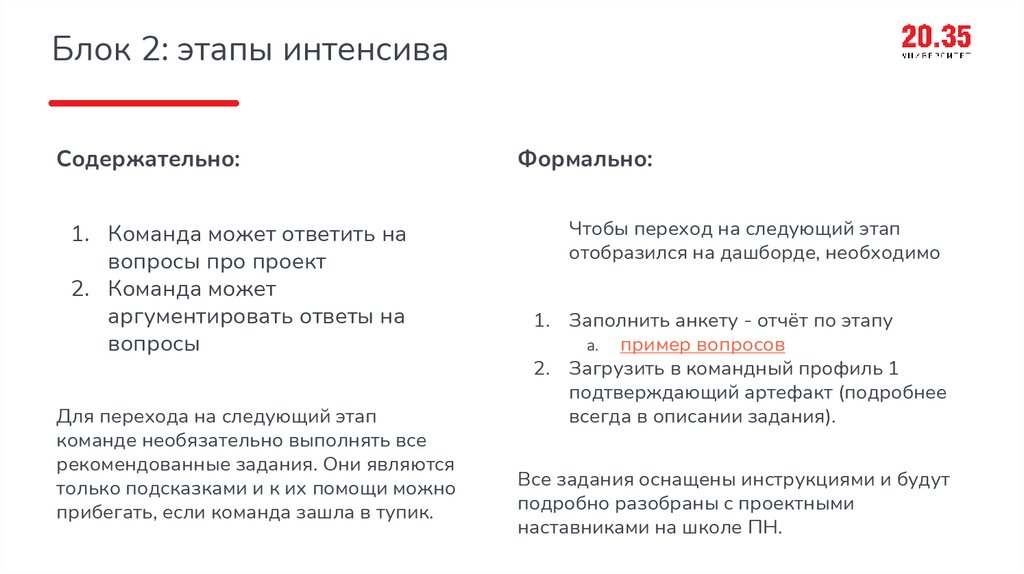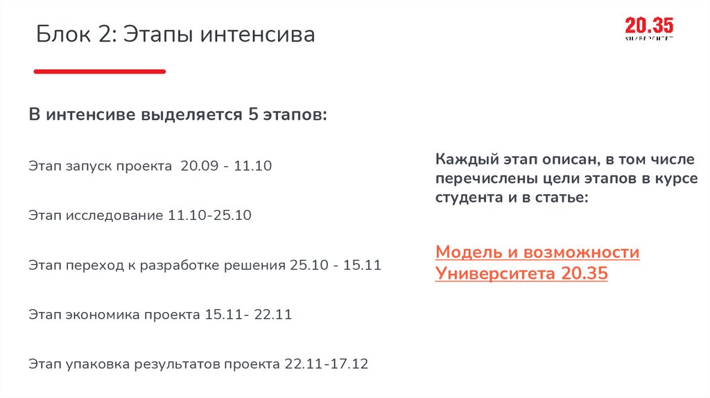 Блок 2: Этапы интенсиваВ интенсиве выделяется 5 этапов: